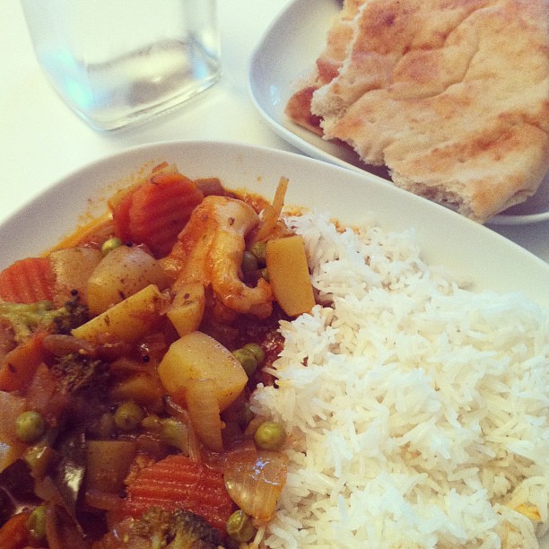 Vegetable curry with rice, naan bread and water