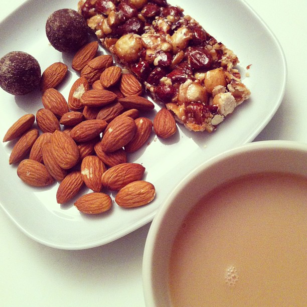 Tea with mixed nut bar, almond balls and organic almonds