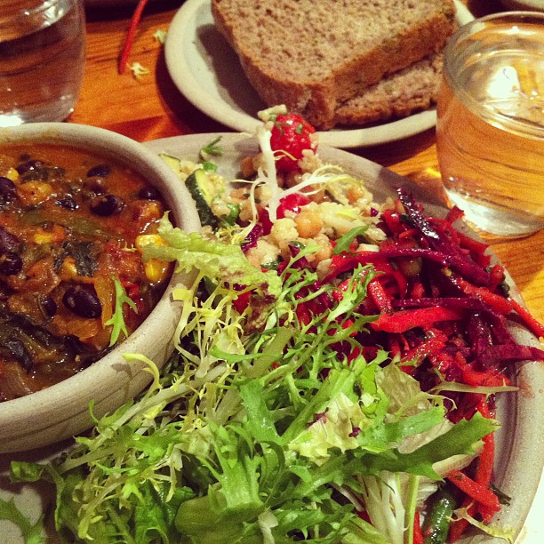 Jamaican black bean soup with salad, water and bread