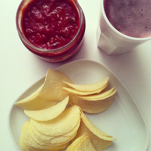 Hot salsa dip with Pringles and cherry juice
