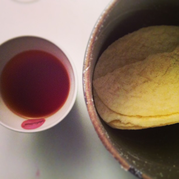 Buttered bagel with tea