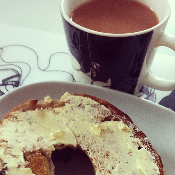 Cinnamon and raisin bagels with tea