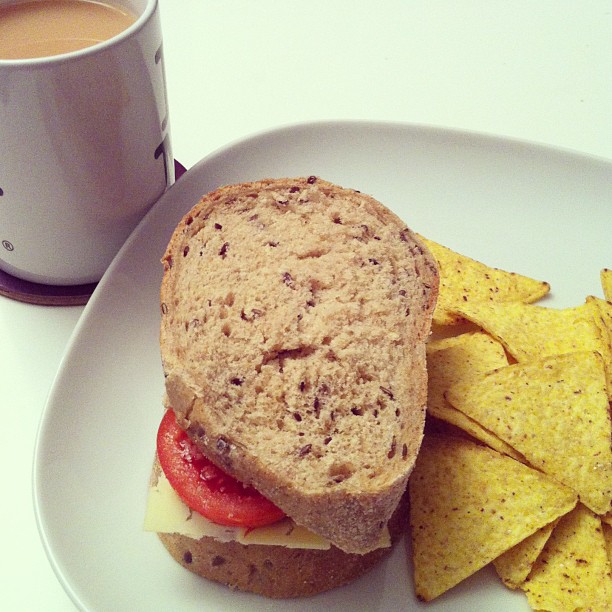 Cheese sandwich with organic corn chips and chai tea in almond milk