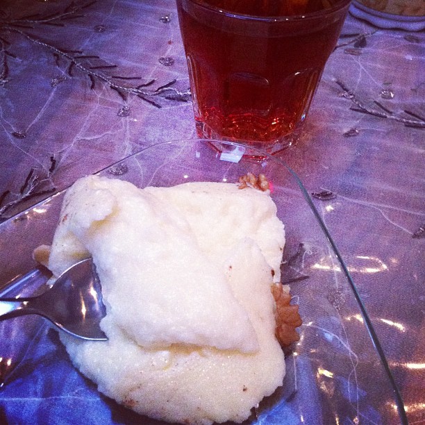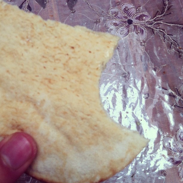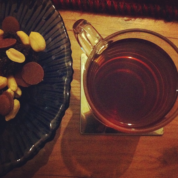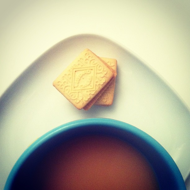 Buttered cinnamon and raisin bagel with chai tea in almond milk