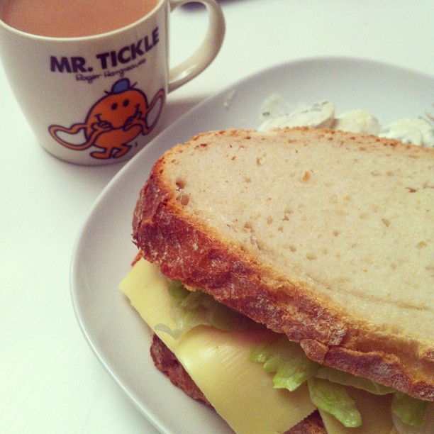Cherry jam on Red Leicester cheese on wholemeal bread with earl grey tea