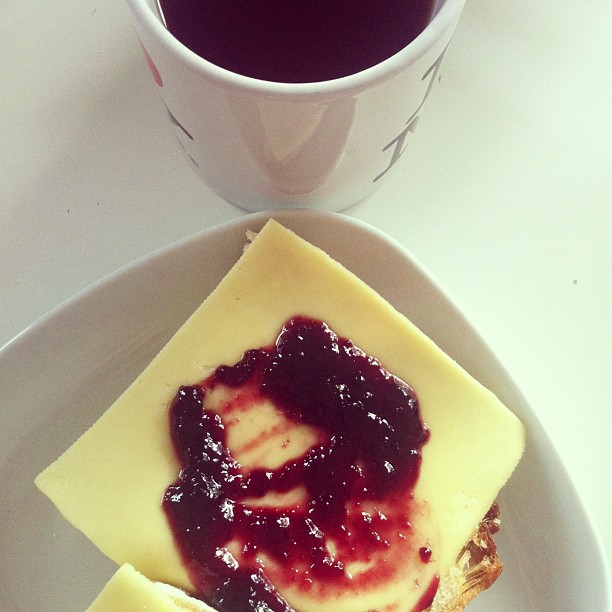 Cheese and black cherry jam on spelt bread with chai tea