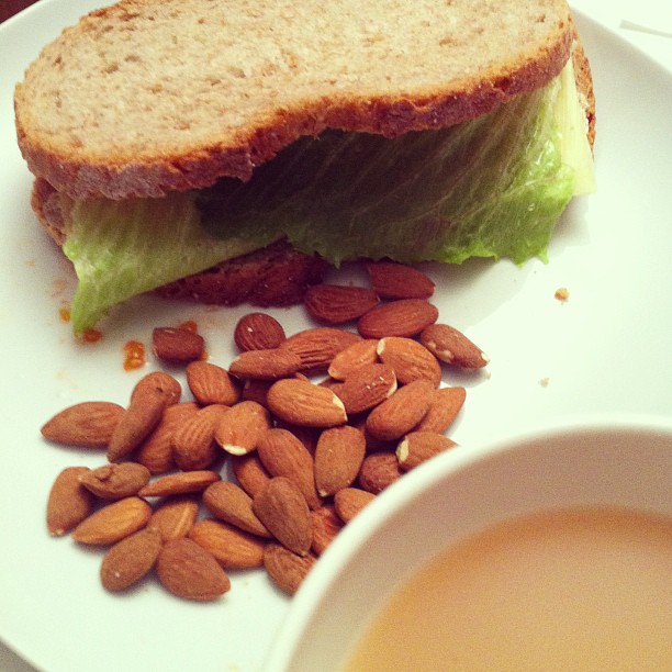 Cheese, cherry tomatoes and lettuce in rustic spelt bread with organic almonds and Darjeeling earl grey tea