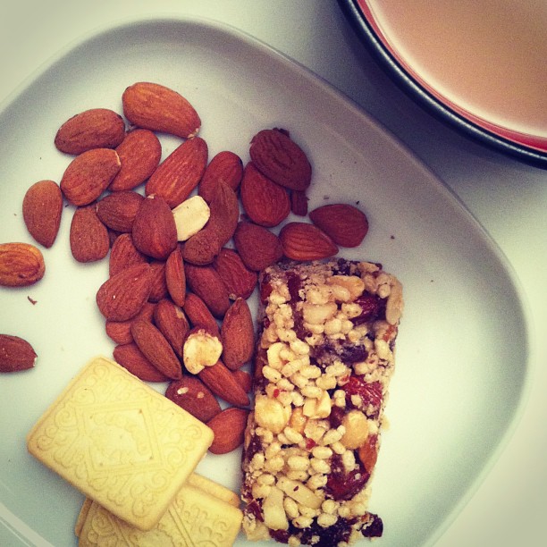 Organic almonds, eat natural bar, custard dreams with Darjeeling earl grey tea